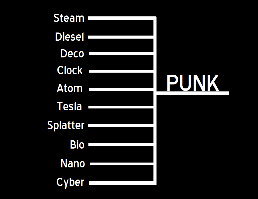 Hey, guys! So, we’re all familiar with Cyberpunk and Steampunk, but there are so many more alternate histories/speculative science fiction genres out there! I came across this handy-dandy infographic and figured I could share a bit of these punk genres for anyone interested.