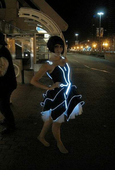 Programmed by Jinyo with some savvy hacking skills and el wire, Victoria aka Scruffy Rebel rocked this Tron Dress at San Diego Comic-Con ‘11… for the Users!