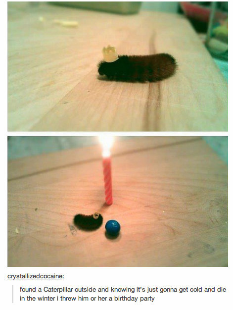 This is super cute! So, to all of you who are sobbing, let me tell you the truth of the matter. Wooly Bear caterpillars are born in autumn/early winter, and live as far north as the arctic. They freeze over the winter months, completely solid. Then, come spring time, they thaw out, and turn into an Isabella Tiger moth. So this little guy/girl is going to have a very happy memory to dream about over the winter. And you can all stop crying now. 🙂