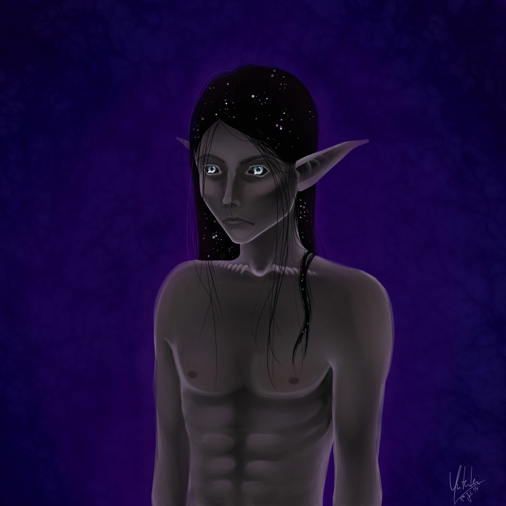 The only things I remember quite vividly are his absolutely black hair that barley showed any reflections (I made up the stars though), his dark skin (but I’m unsure if it was gray, brown or really black), his elf ears, his light eyes (again, I don’t remember the color), his eyebrows (for some reason) and his really strange collar bones. But they are charming! He’s charming!! I often dream of Characters and they turn into OCs then. Usually I make up most details but for some reason I don’t want to in this case. I rather hope about dreaming of him again. This is also pretty likely since I dream a lot and often have continued dreams. Maybe I can even catch his name then? The only things character wise I remember are that he were pretty strict, on time and tidy but also very caring and soft. I also remember he was some kind of master and had some servants. Also he needed to find true love?? This is all very blurry…