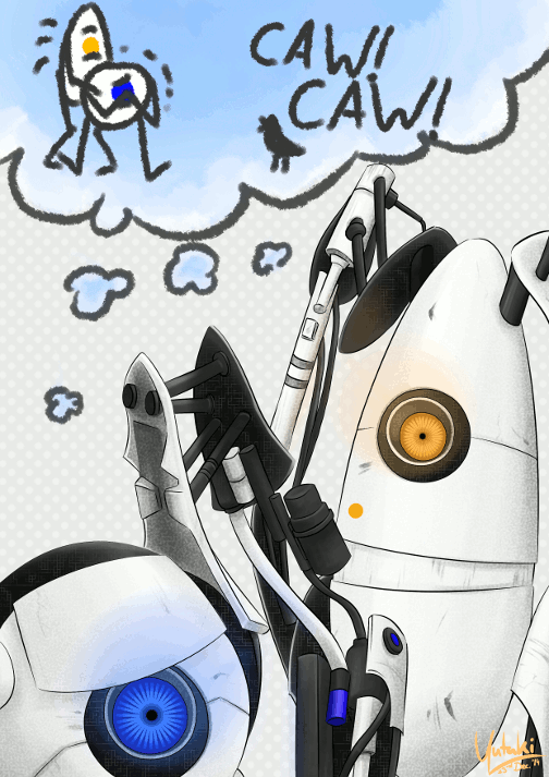 It shows Blue and Orange spacing off (probably while a Test, annoying GLaDOS) thinking about one encounter with the bird, which might or might not be very dangerous!